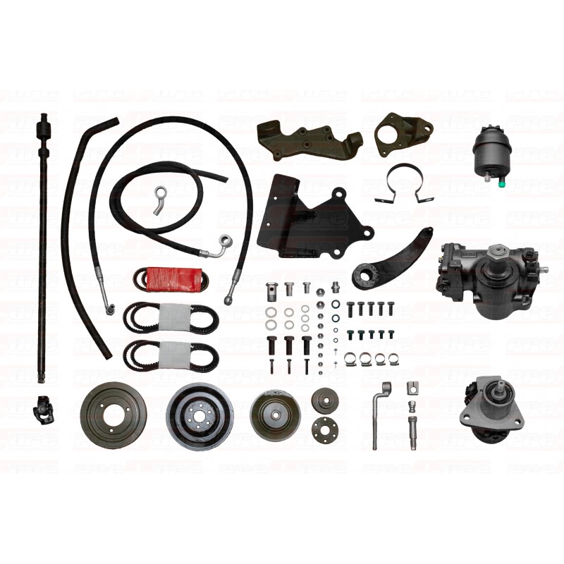 -Caixa 8090, Bomba hidráulica, Reservatório, Mangueiras, Suportes, Polias, Kit de parafusos, Arvore, Coluna e Braço pitman.